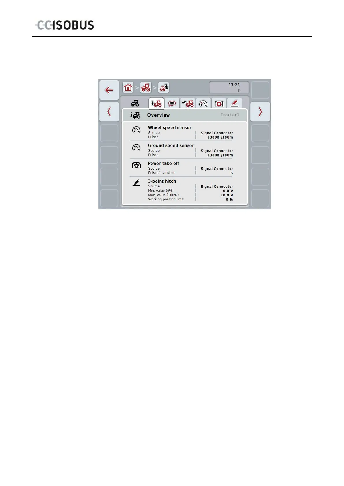 This tab shows the settings for speed, the power take off and the 3-point hitch.