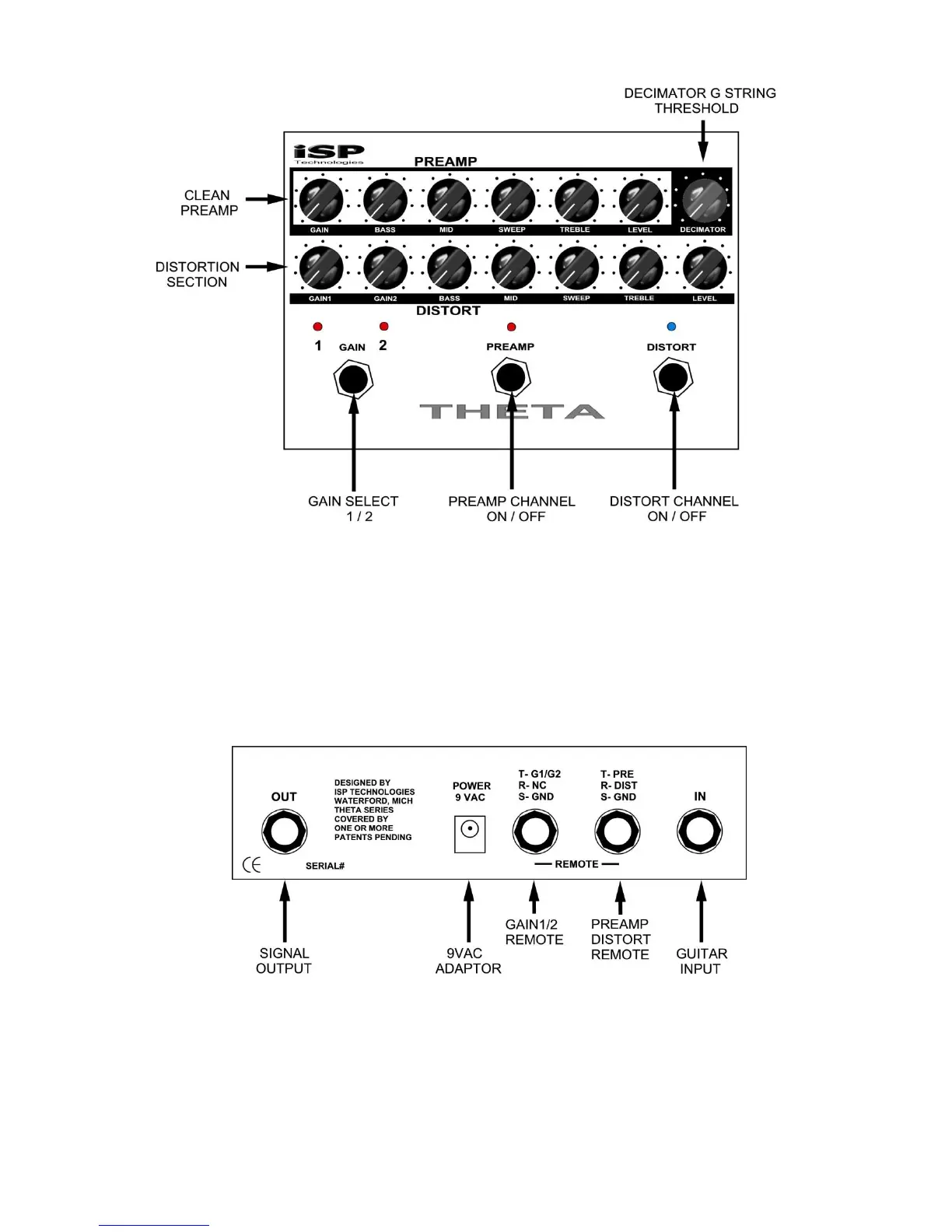 output signal and two remote jacks which allow the THETA preamp pedal to be switched