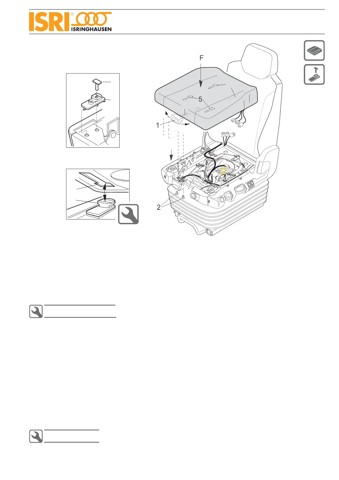 Press down the seat cushion‘s front keyholes (5) onto the sliders at the front and press down cushion in direction •