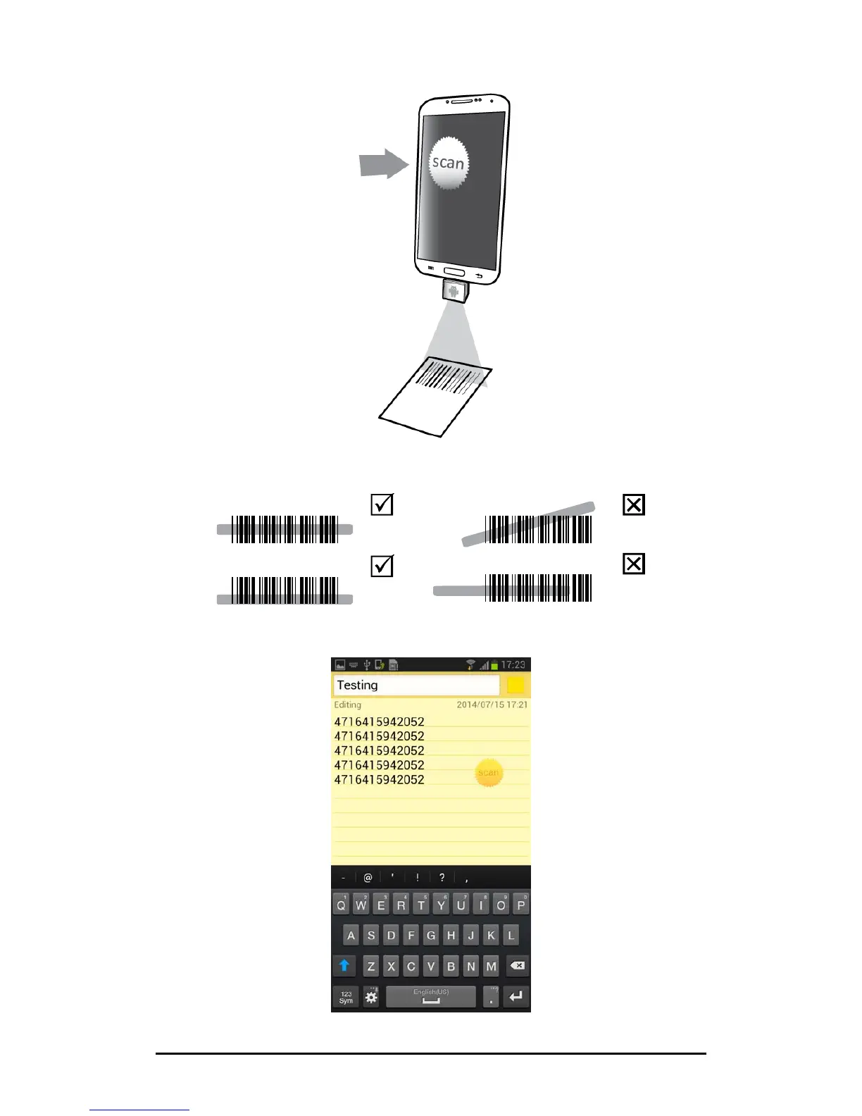 4. To scan a barcode, make sure the aiming beam crosses every bar and space of the