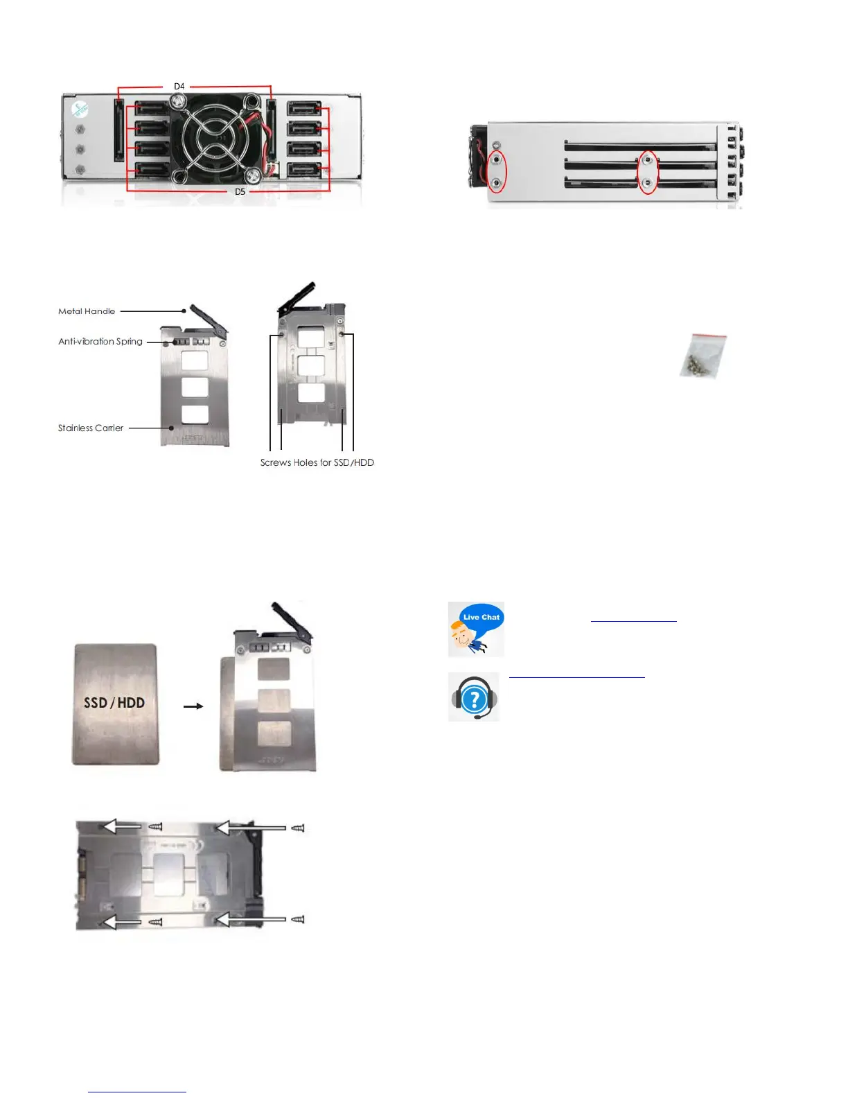 2. Use provided screws to fasten SSD/HDD to the tray from bottom