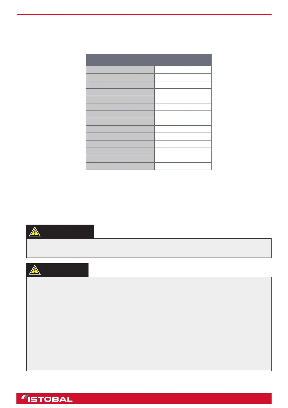 The following table shows the maximum allowable limits set by ISTOBAL.