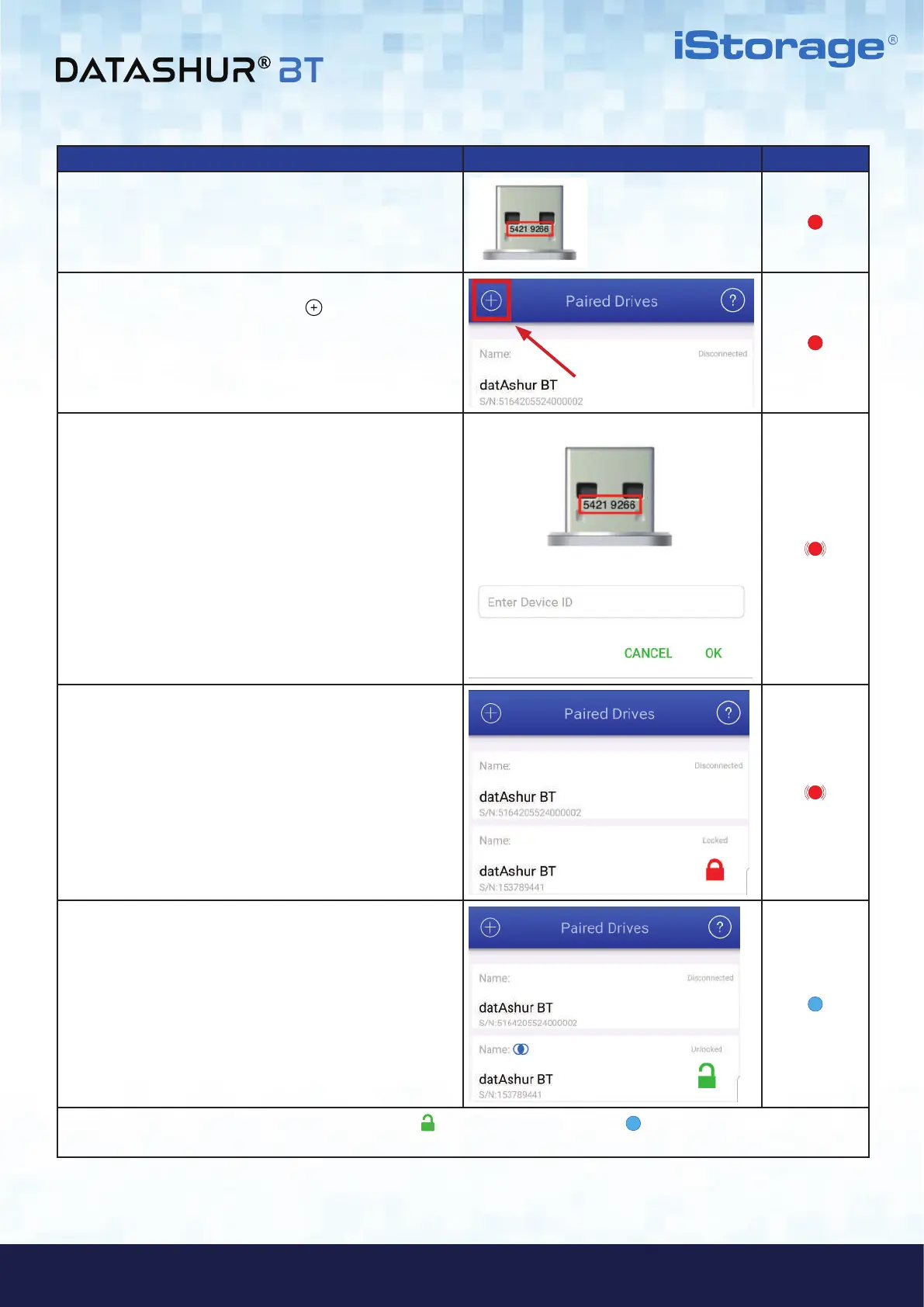 Your datAshur will unlock showing a GREEN padlock ( ) on the App and solid Blue ( ) LED on your datAshur BT and