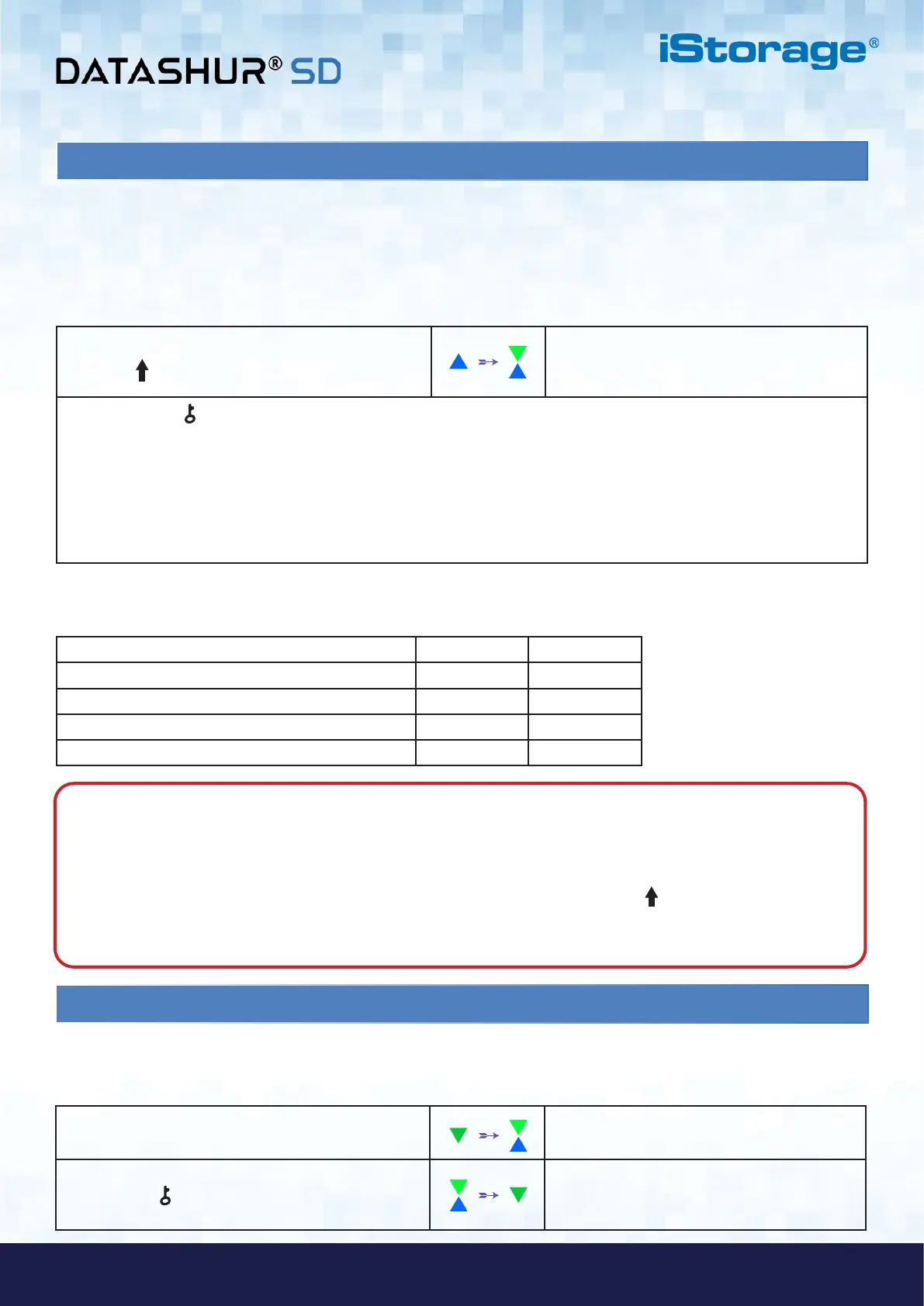 Note: When the datAshur SD is in Admin Mode, the BLUE LED will remain on and solid for 30 seconds only,