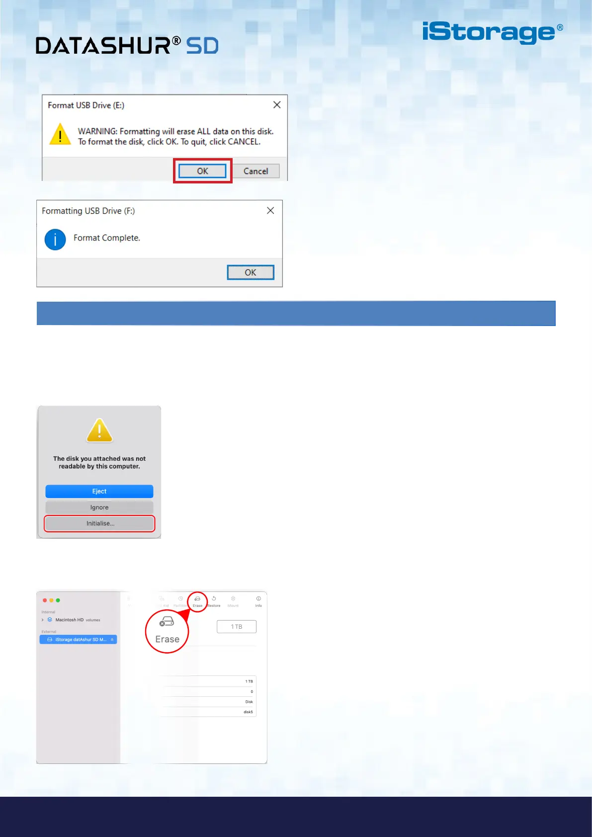 6. Click OK and the procedure will finish formatting the drive and will then confirm that formatting has been completed.