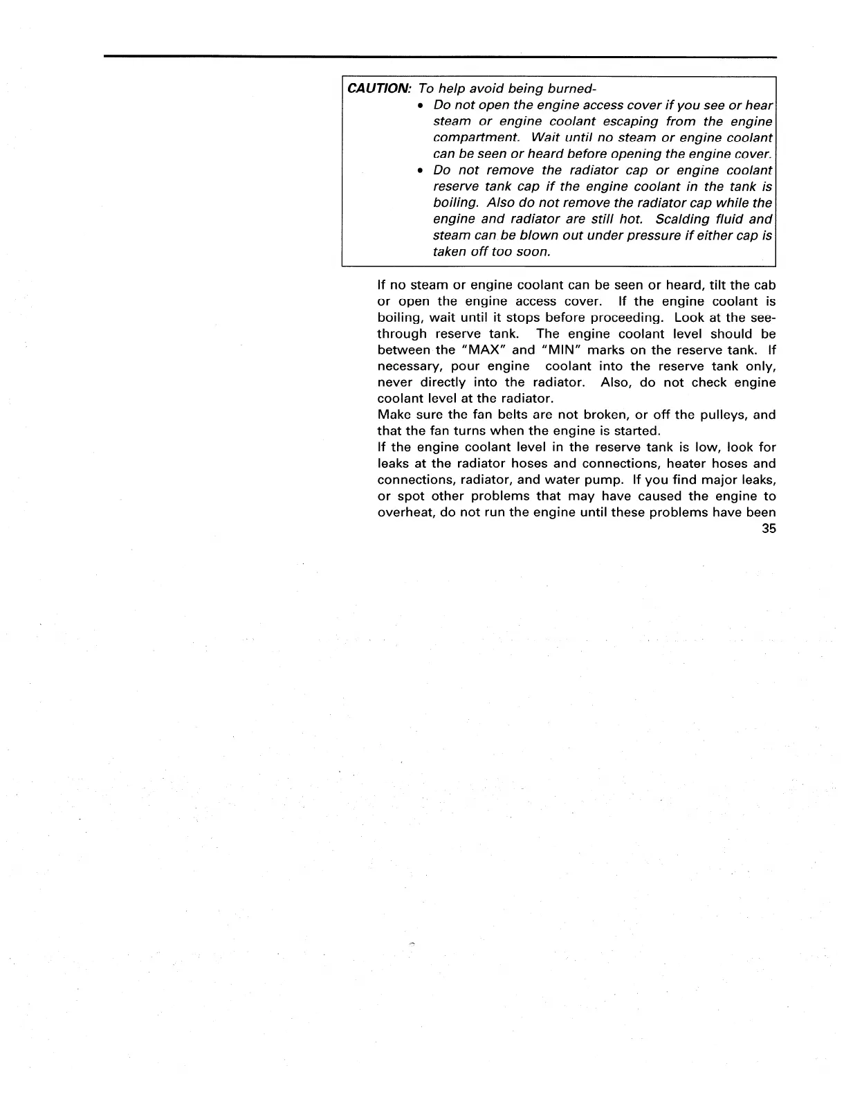 If no steam or engine coolant can be seen or heard, tilt the cab