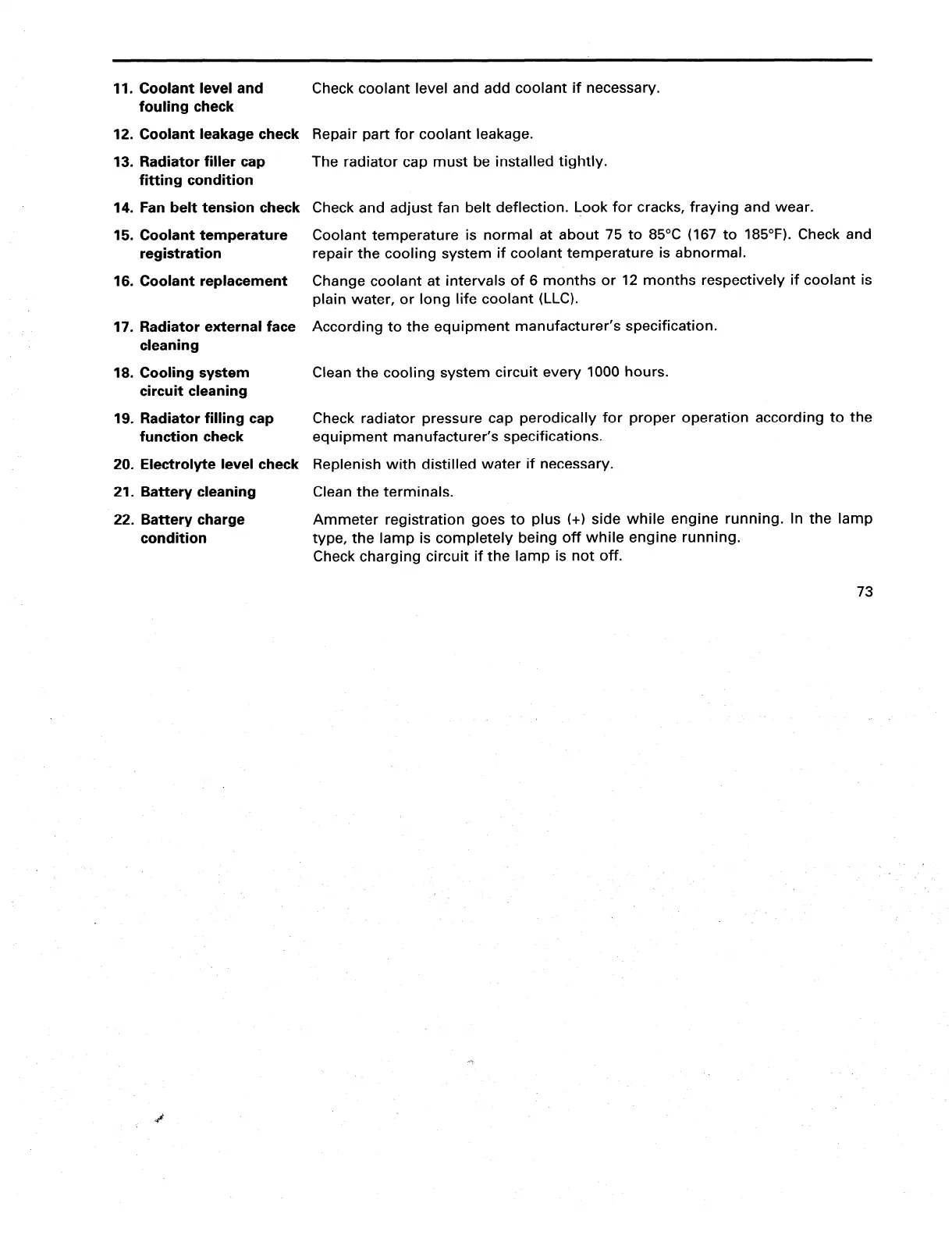 14. Fan belt tension check Check and adjust fan belt deflection. Look for cracks, fraying and wear.