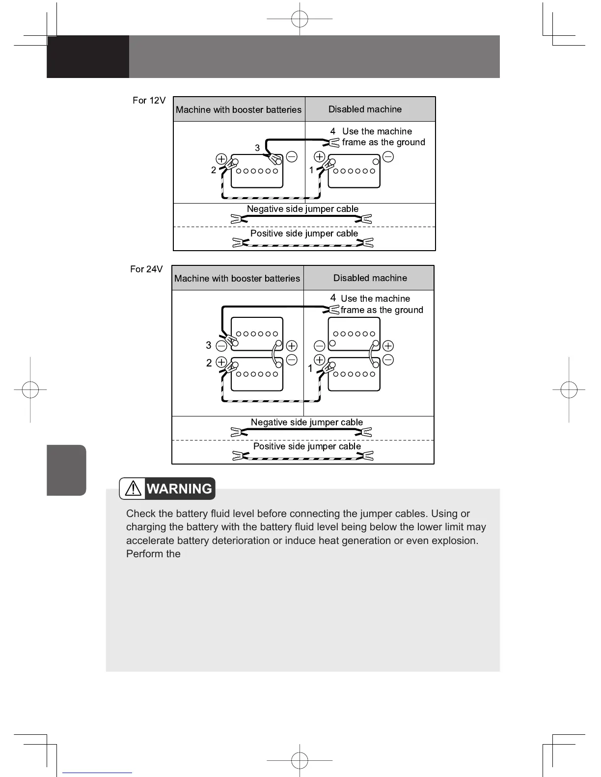 Check the battery fluid level before connecting the jumper cables. Using or