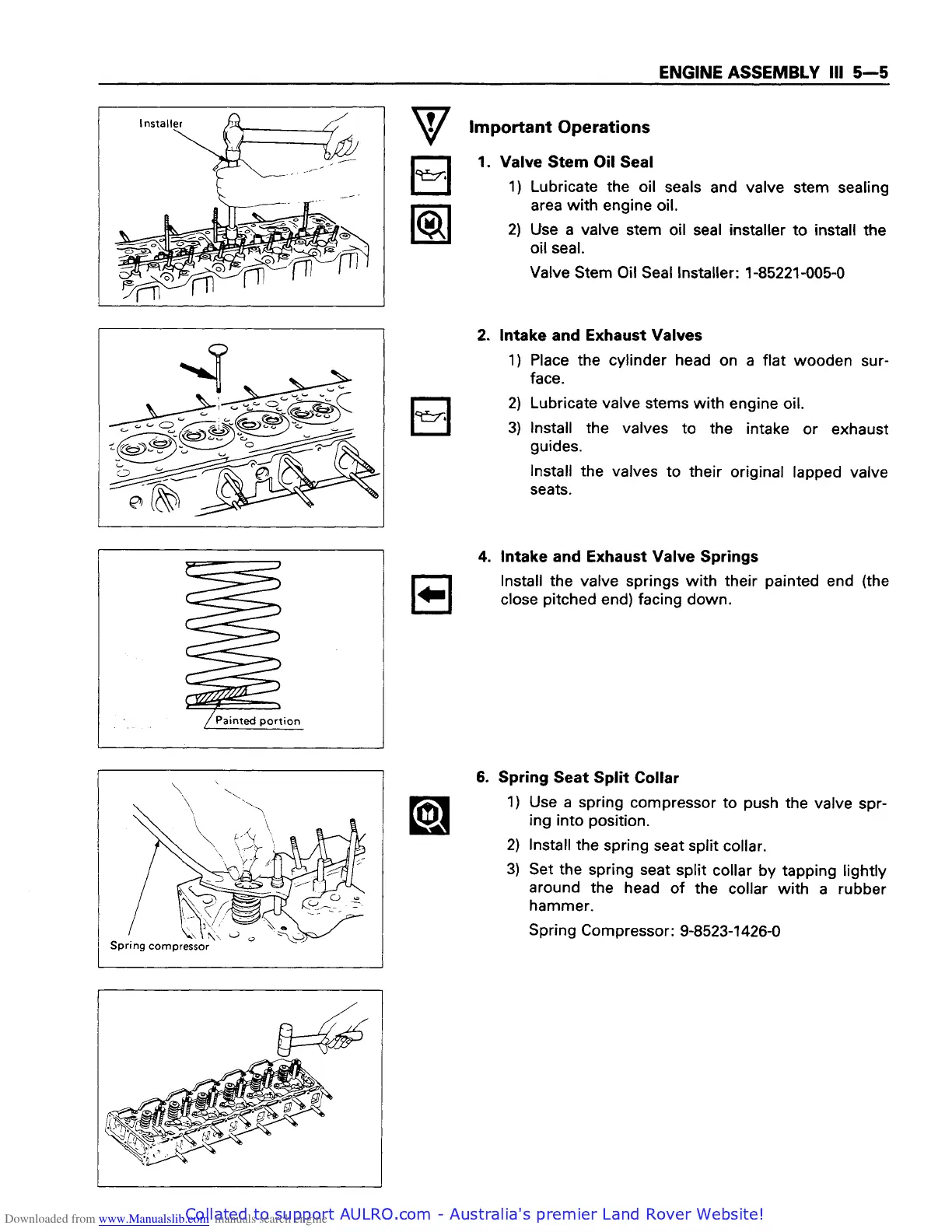 Isuzu 6BD1 - Valve Stem Oil Seal Installation; Intake and Exhaust Valves Installation; Intake and Exhaust Valve Springs Installation; Spring Seat Split Collar Installation