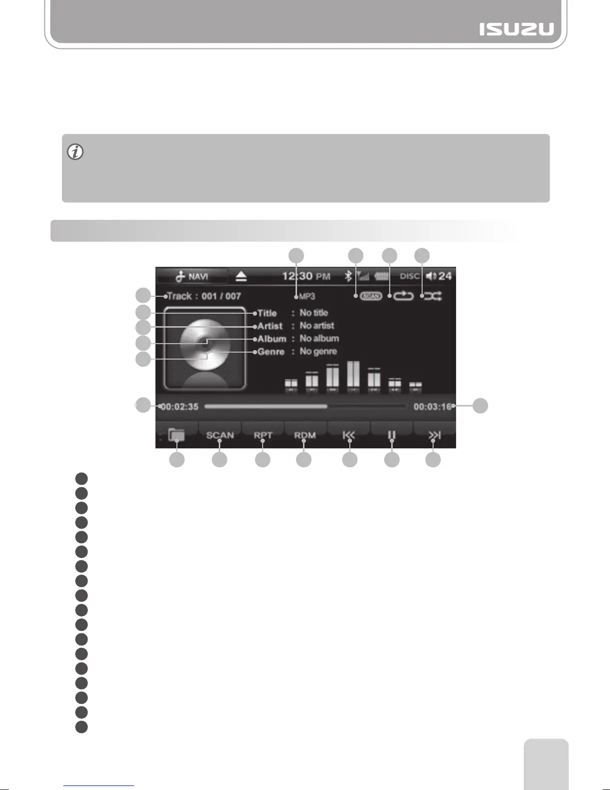 File List: Displays the [current track/total tracks] number of the CD.