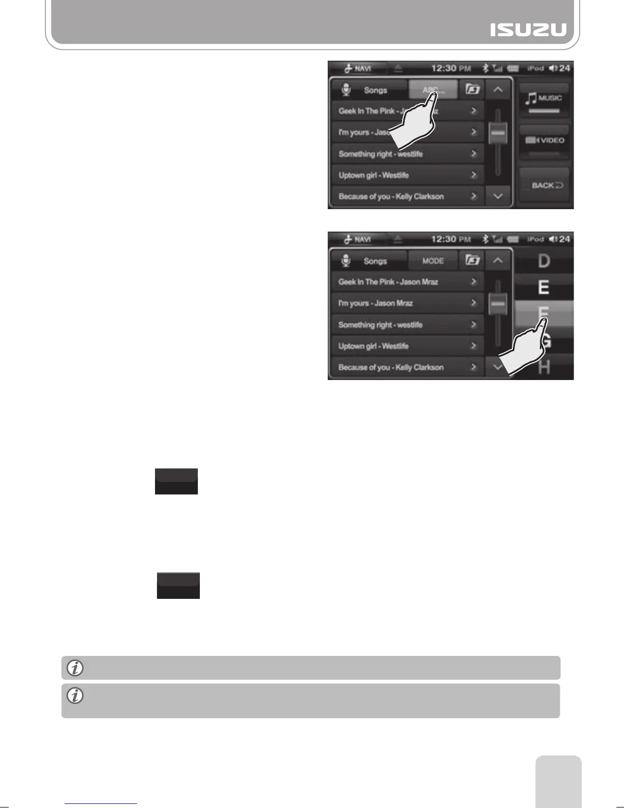 E. By pressing MODE button the iPod list