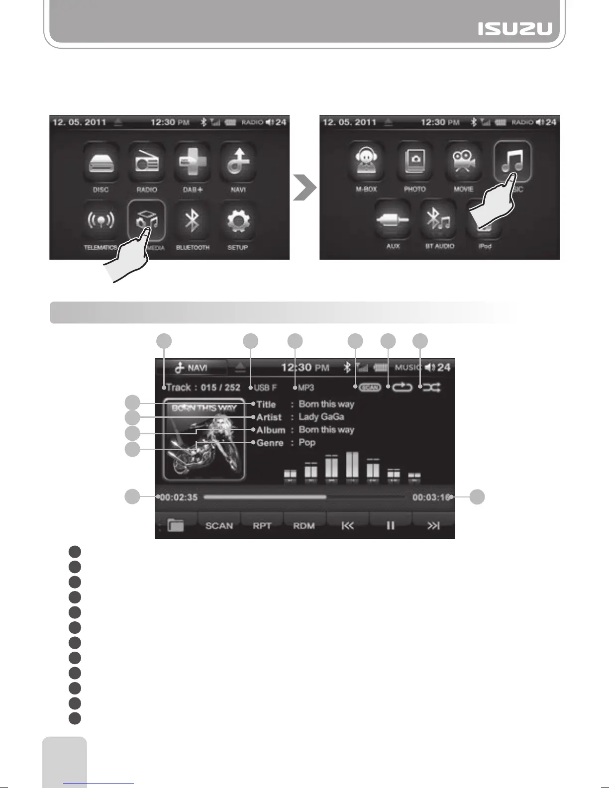 Track List: Displays the [current track/total tracks] number of the storage device.