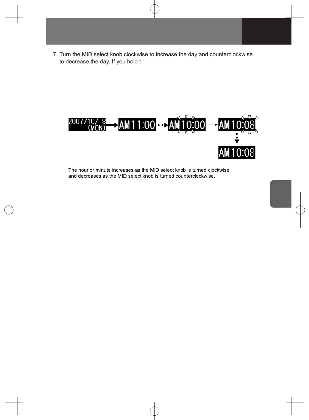 4. Set the hour: Turn the MID select knob clockwise to increase the hour and