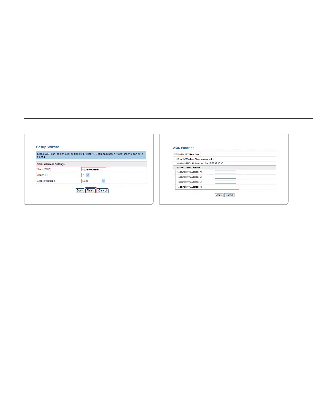 WDS Function, and enter the MAC address of the Repeater