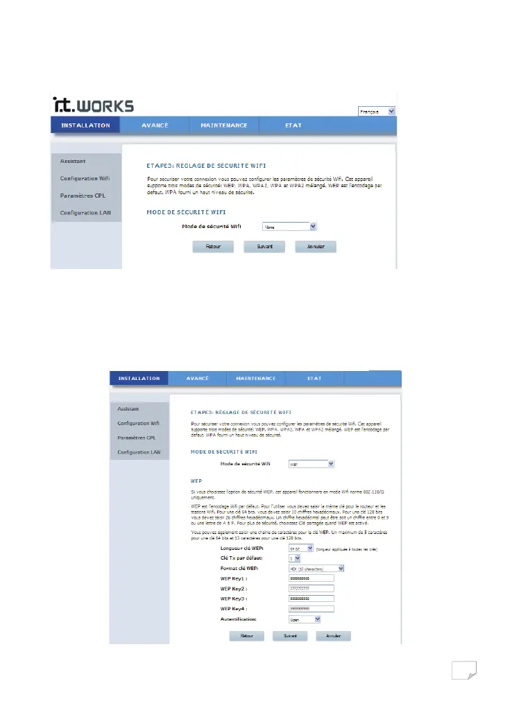 Si vous choisissez WEP dans le menu déroulant des modes de sécurité sans fil, la page suivante s'affiche.