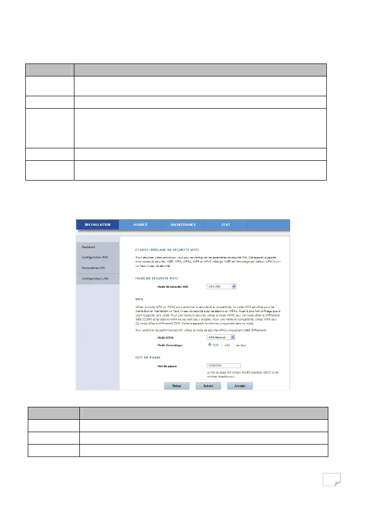 Le tableau ci-dessous décrit les paramètres en rapport avec le mode WPA: