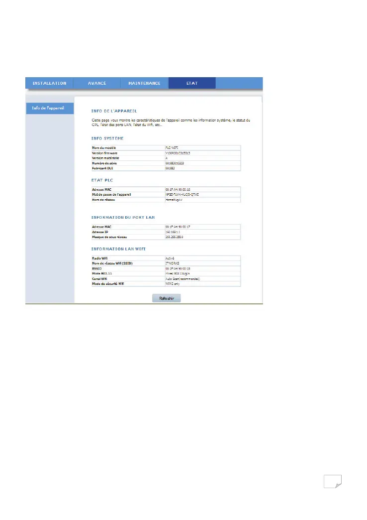 Cette page contient les informations en rapport avec le périphérique: infos système, état CPL, infos LAN et WLAN. Cliquez sur