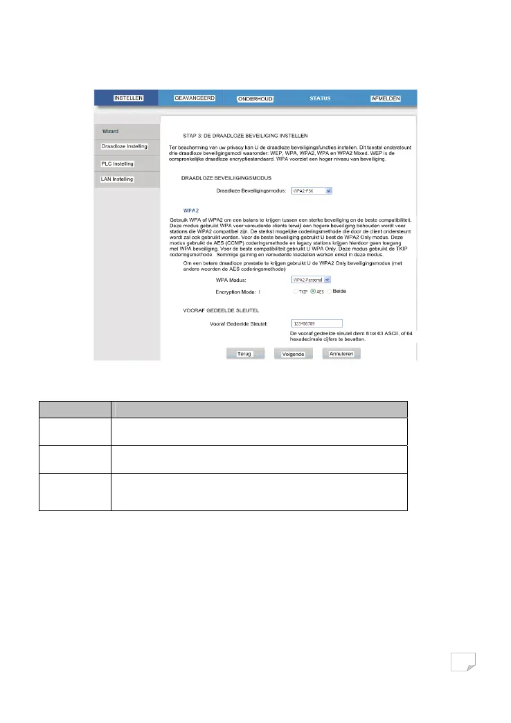 De volgende tabel beschrijft de parameters met betrekking tot de WPA2 modus: