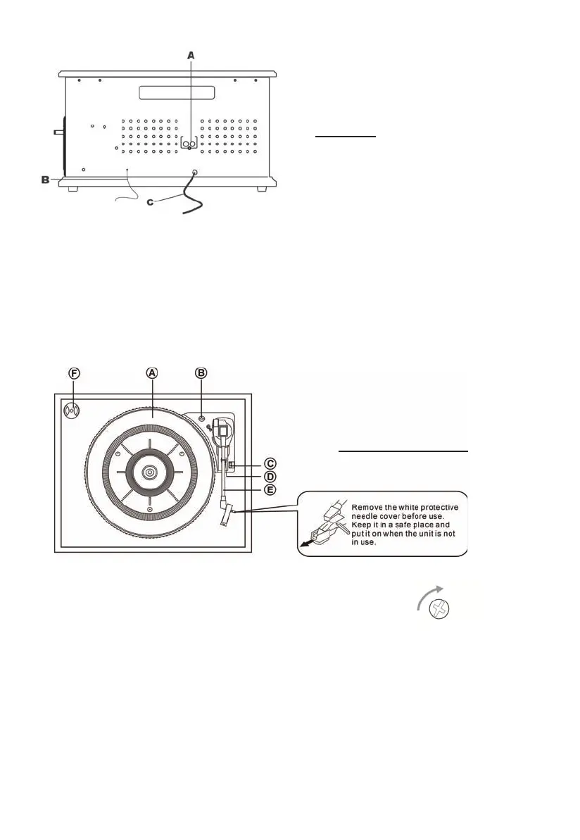 E. Tone Arm. (Before use, completely loosen the fixed plastic tie on the tone arm and uplift tone arm.)