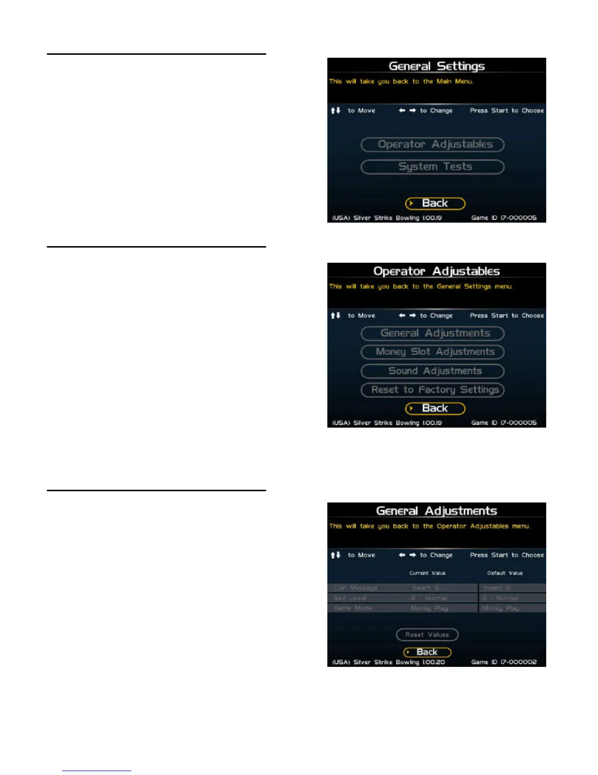 including attract mode sounds, game volume, and stereo