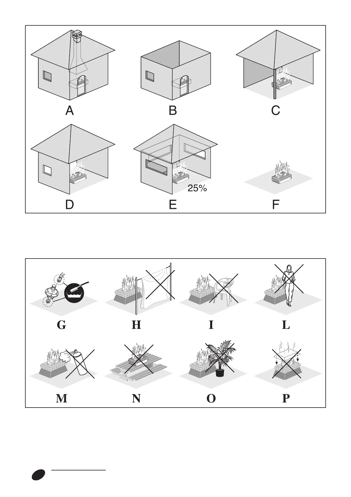 N) Do not install the appliance on mobile and not firmly anchored to the ground or on a wall.