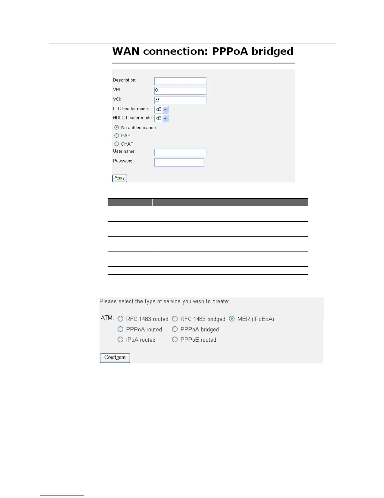 Choose MER (IPoEoA) and click on “Configure” to go to the MER service creating