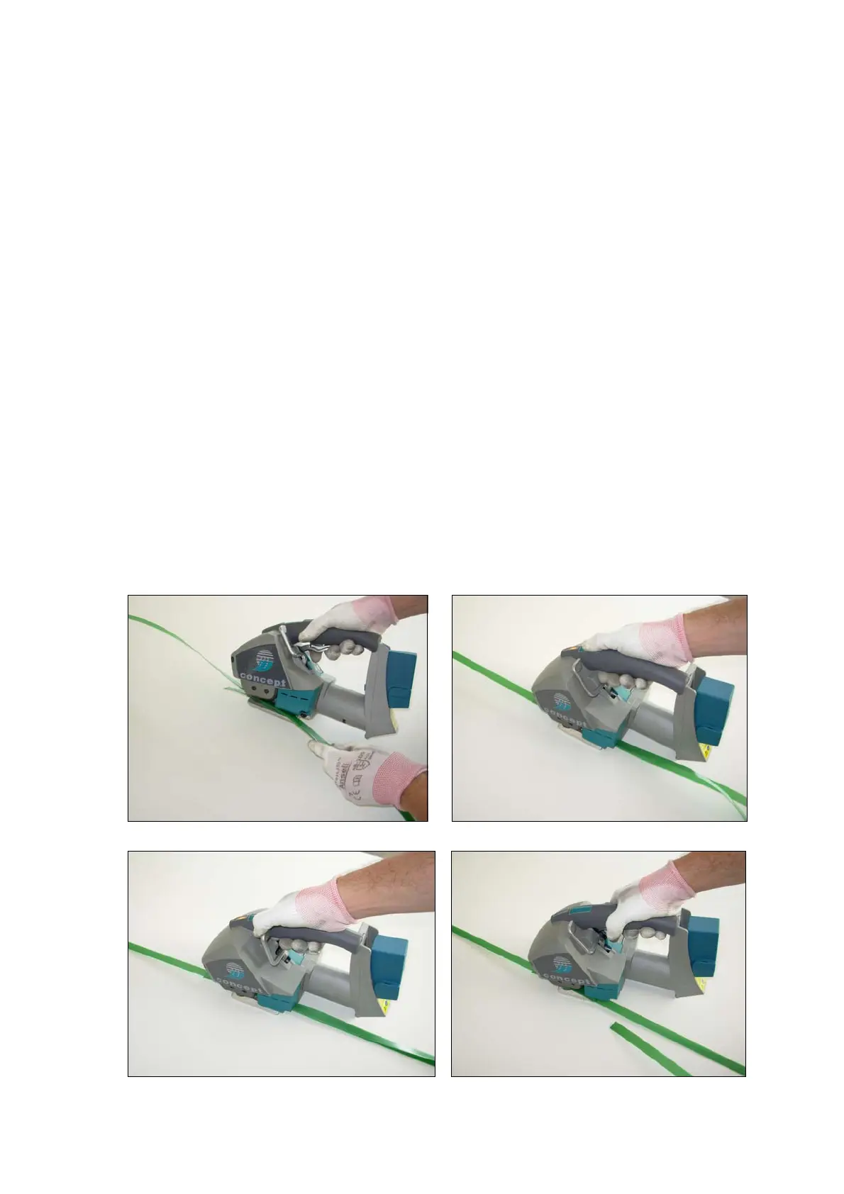 geschnitten wird. Das Kunstoffband um die Ware umführen, das Ende mit der linken Hand halten und mit der rechten Hand das Band