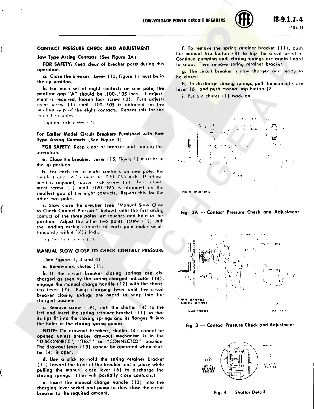ITE K-3000 - Contact Pressure Adjustments; Jaw Type Arcing Contacts Adjustment; Butt Type Arcing Contacts Adjustment; Manual Slow Close for Contact Pressure Check