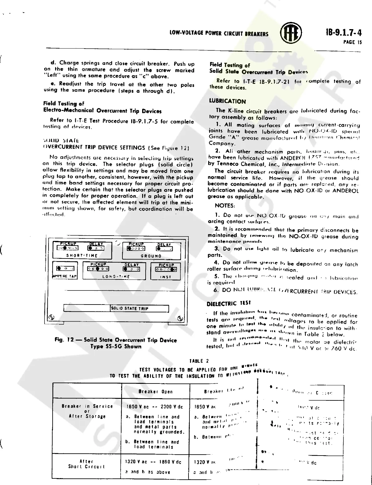 ITE K-3000 - Solid State Trip Settings, Testing, and Lubrication; Solid State Overcurrent Trip Device Settings; Field Testing of Trip Devices; Dielectric Testing Procedures