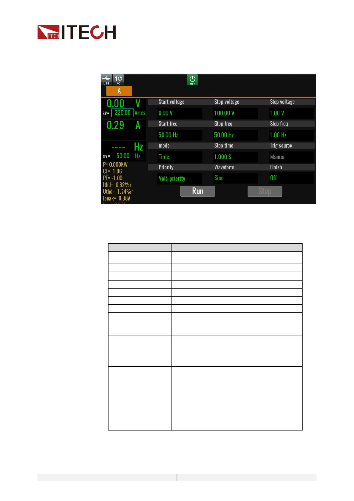 2. Set the voltage and frequency parameters in the sweep interface.