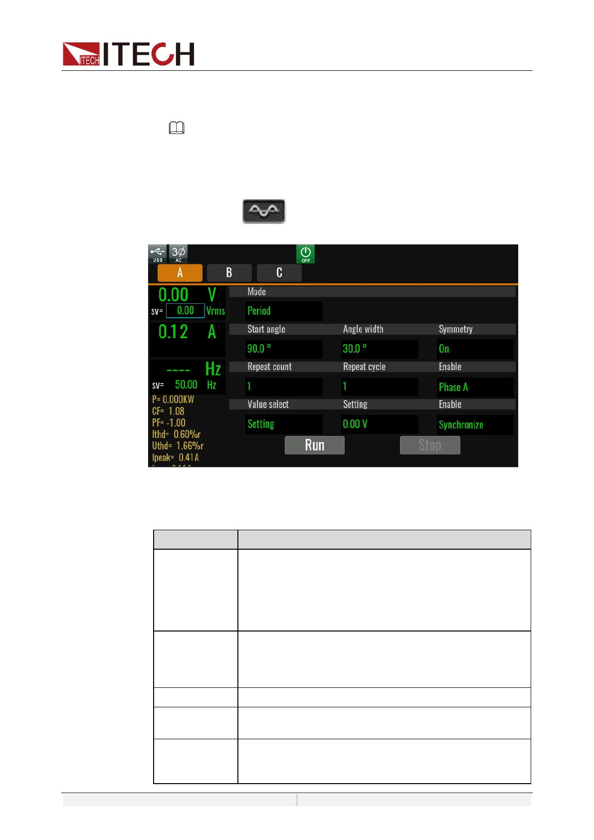 Period: Period mode. Execute the surge/sag based on the