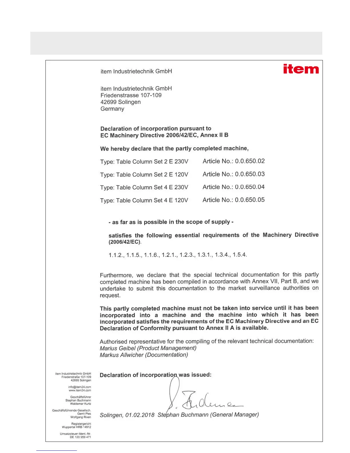 ITEM Work bench E - Annex; 12.1 Declaration of Incorporation
