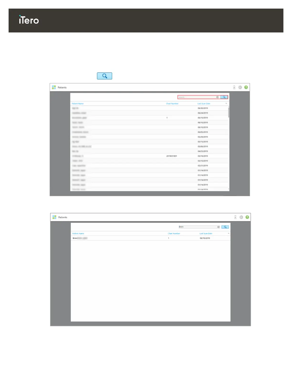 If required, you can search for patients in the iTero database using their names or chart numbers.
