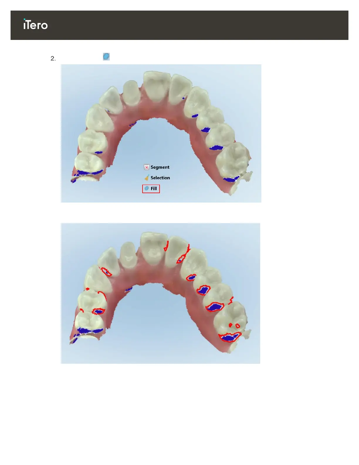 iTero Element 2 - Figure 73: Fill Tool; Figure 74: Areas that Require Scanning Are Highlighted in Red - Fill Tool