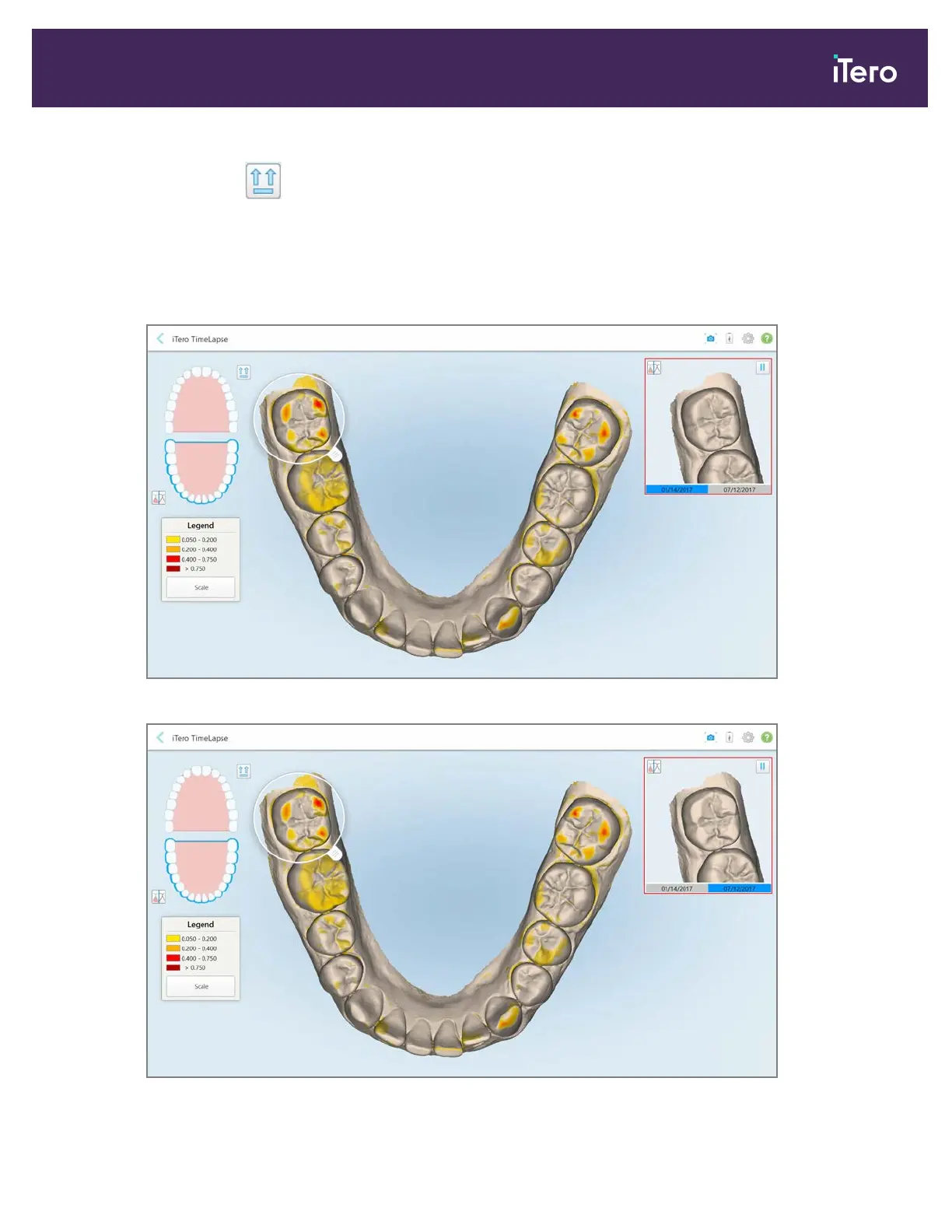 An animation is displayed, comparing the state of the teeth in the current area of interest on the selected scan
