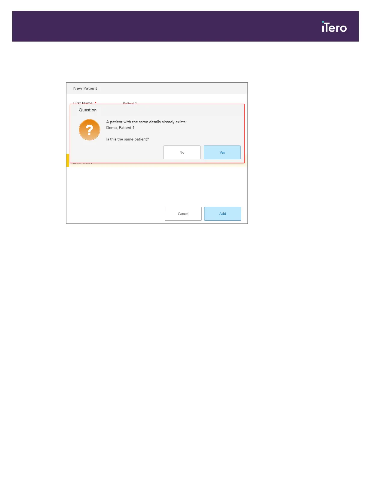 You are prompted to confirm whether the new patient is the same patient as the existing patient.
