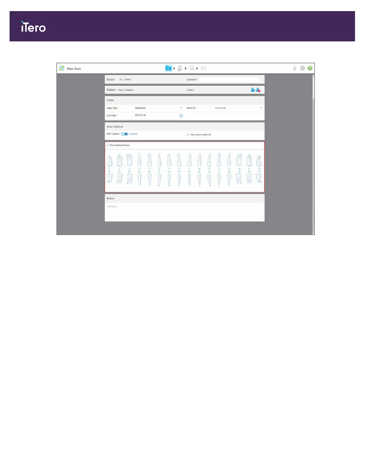 Figure 88: New Scan window – Restorative case type with a tooth chart