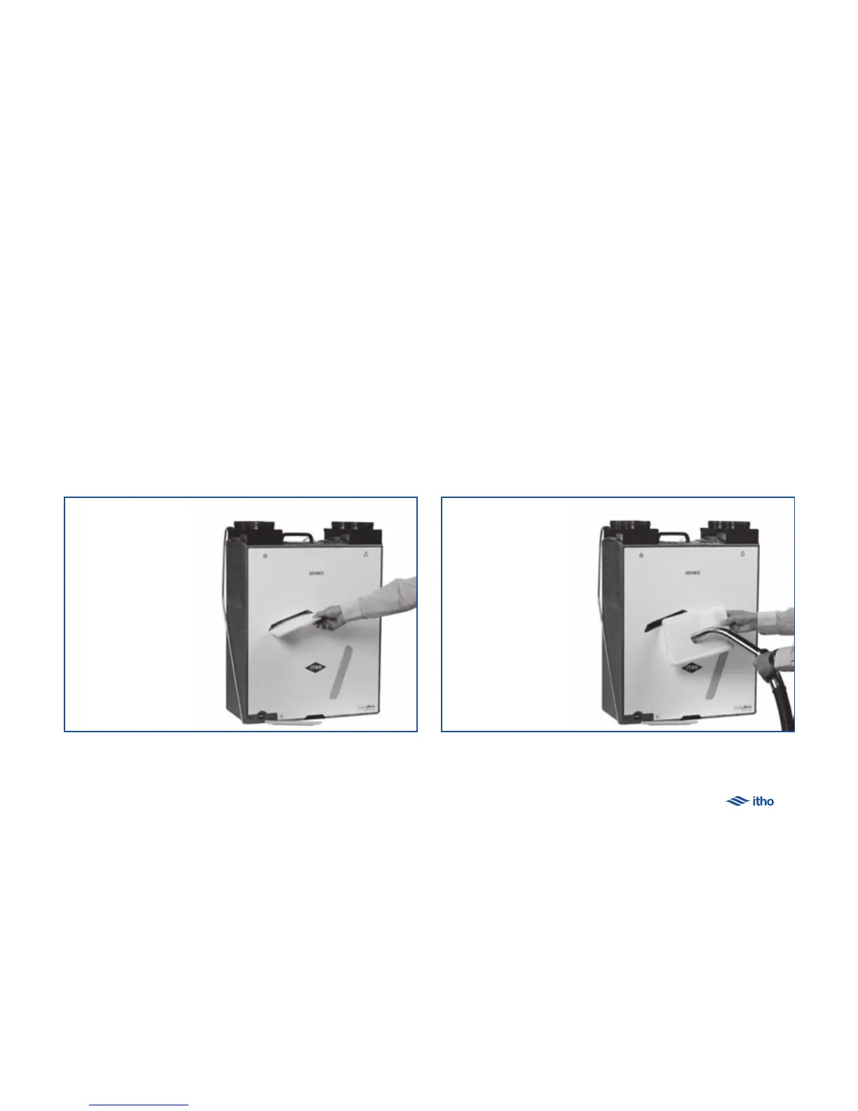 B) Remove the filter from the unit. C) Clean the filter with a vacuum cleaner.