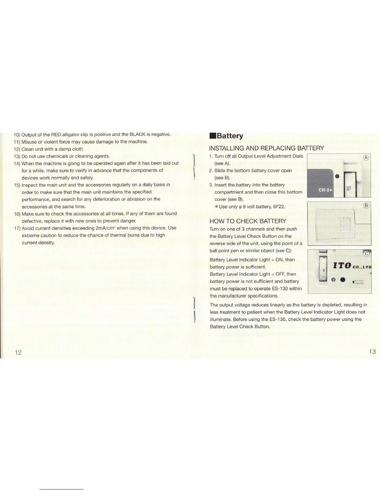 ITO ES-130 - Battery; Installing and Replacing Battery; How to Check Battery