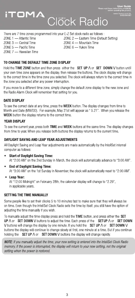 iToma CKS3501BT - Time Zone and Manual Adjustments; Changing the Default Time Zone; Viewing Date and Year; Daylight Saving and Leap Year