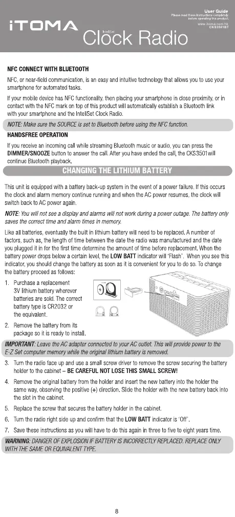 iToma CKS3501BT - Advanced Bluetooth and Battery; NFC Connect with Bluetooth; Hands-Free Call Operation; Changing the Lithium Battery