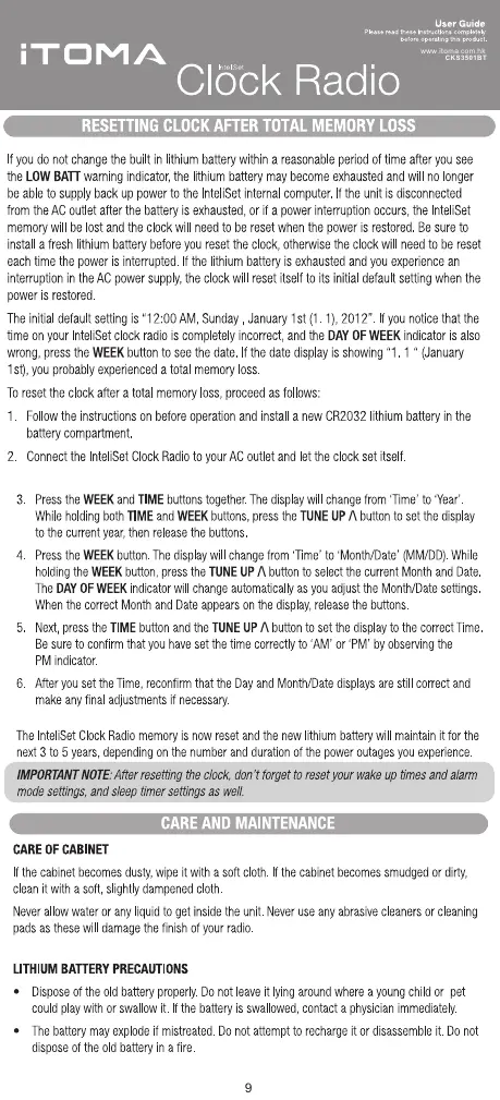 iToma CKS3501BT - Clock Reset and Maintenance; Resetting Clock After Memory Loss; Cabinet Care and Cleaning; Lithium Battery Precautions