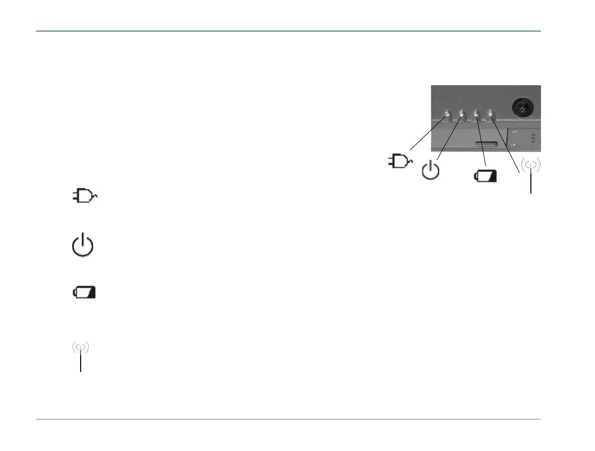The case front LED’s indicate external power, unit ON/OFF, battery status, and radio ON/OFF. These indicators