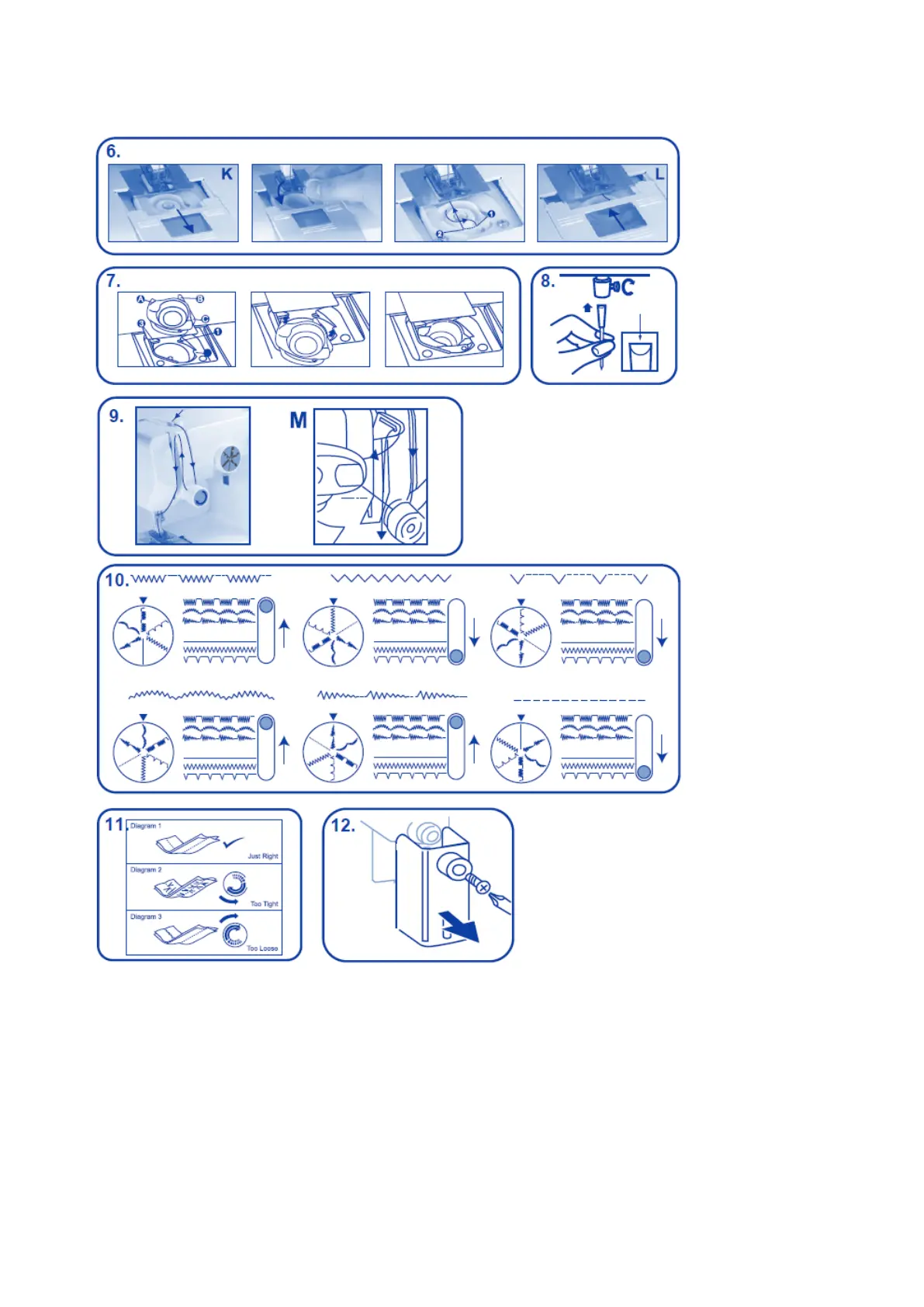 Popis obr. 11: Diagram 1: Správné nastavení, Diagram 2: Příliš napjatá nit, Diagram 3: Příliš povolená