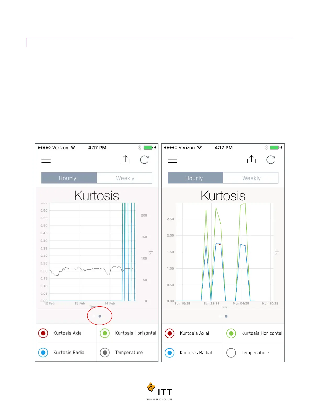 Figure36: Tap the small grey button under the Trend to display Kurtosis, Kurtosis Trend with Temperature removed on right