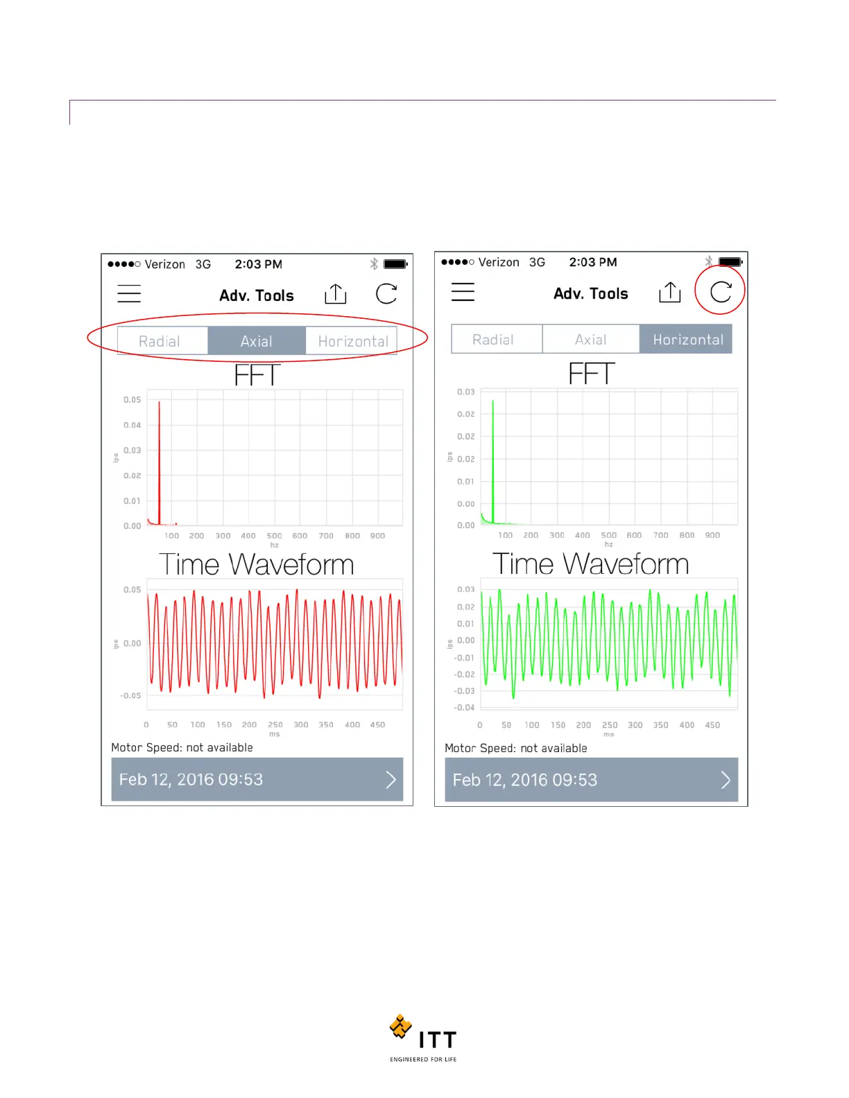 top of the spectrum. See figure 39. To request an updated FFT/TWF, tap the refresh (circular arrow) at the top right of the