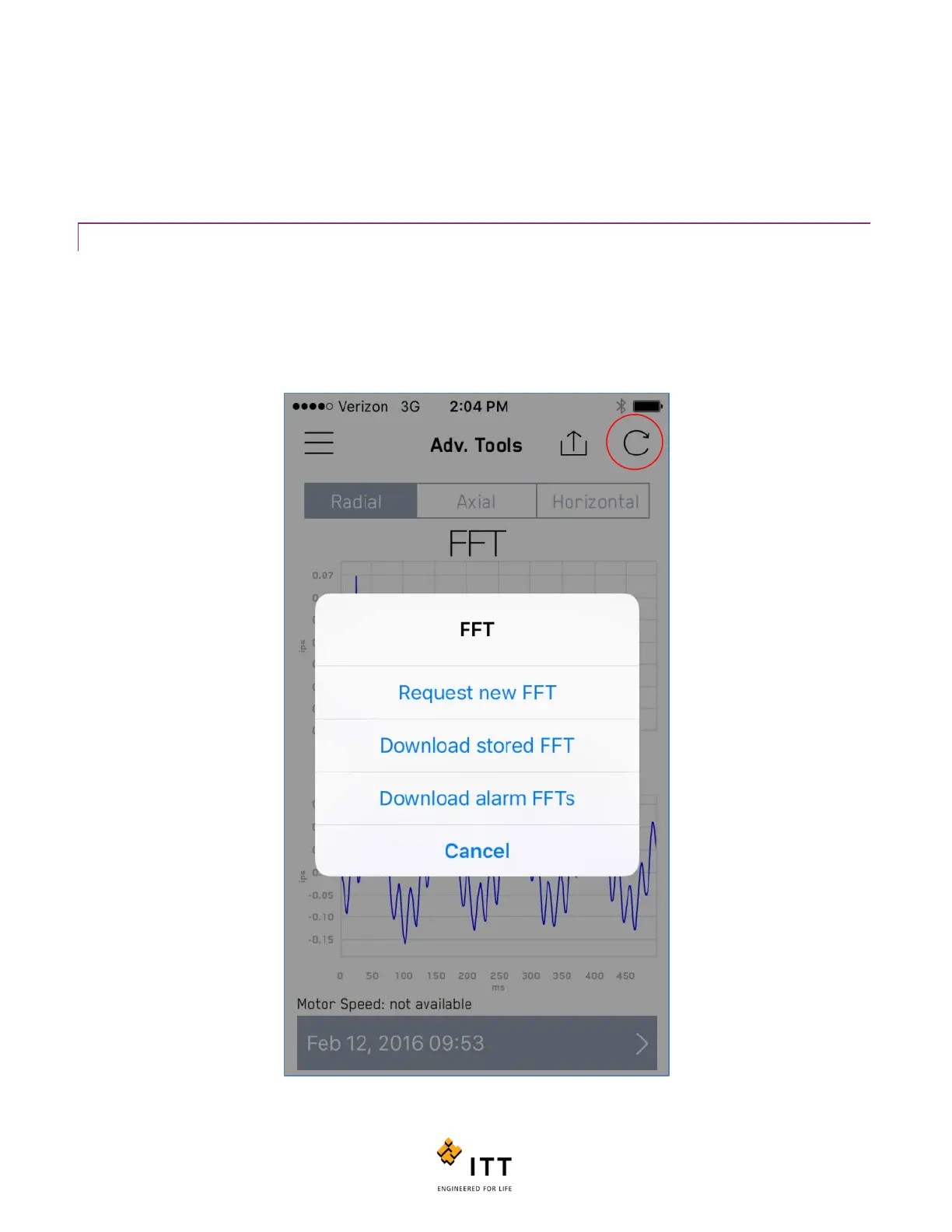 monitoring, to access historical FFT and TWF data sets, simply tap the circular arrow icon at the top right of the page while