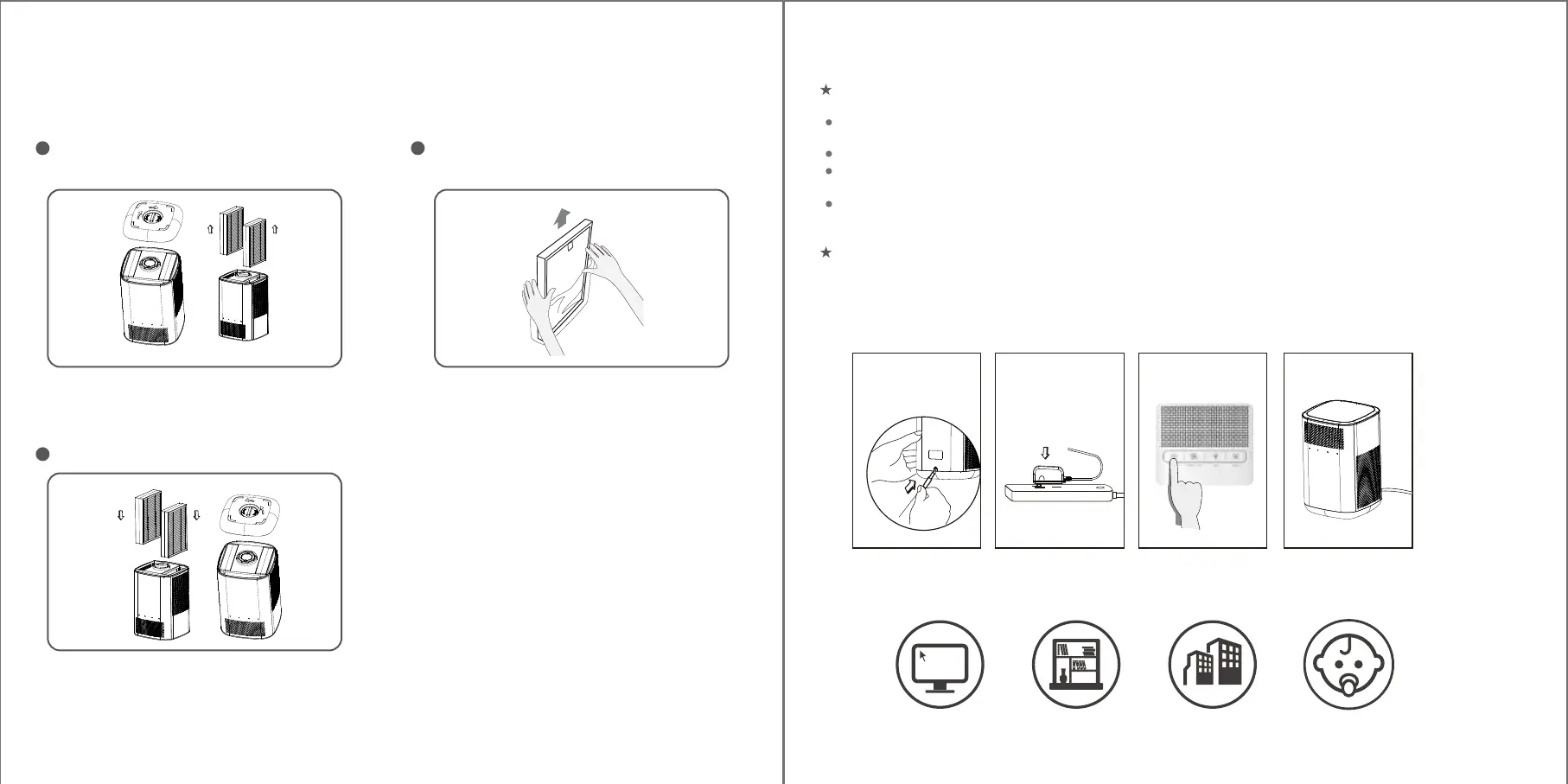 空気清浄機本体に電源アダプター(DC 12V)を付けて、適用電圧のコンセントに差し込んでいるかを確認して