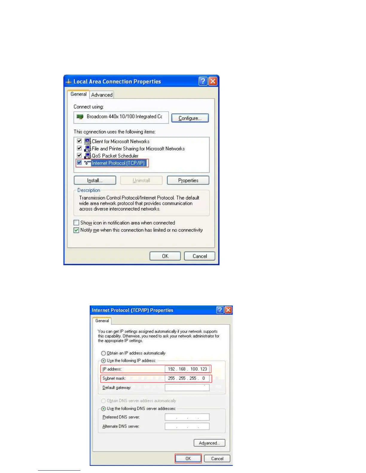 f. Sélectionnez Utiliser l'adresse IP suivante. Tapez l'adresse IP 192.168.100.X (X étant