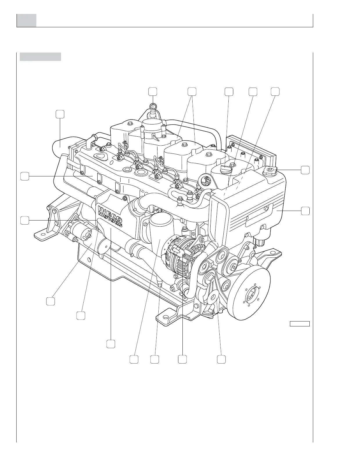 15. Alternator - 16. Cap for engine coolant discharge and recirculation from sanitary water heating system - 17. Oil filter.